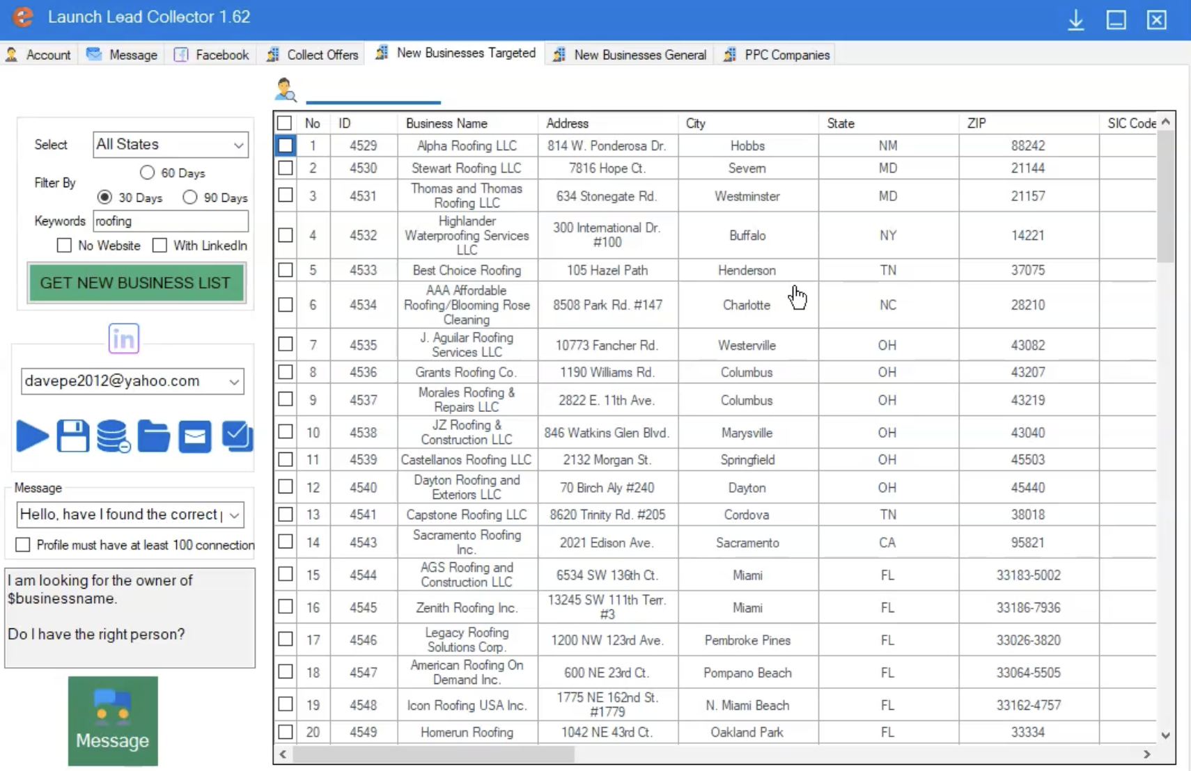 Search new businesses by type (e.g. roofing, dental, legal) and own the data or message directly.